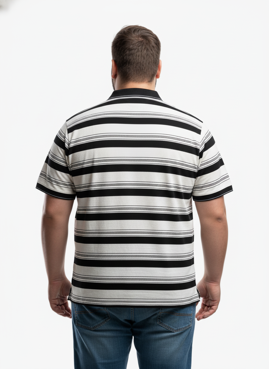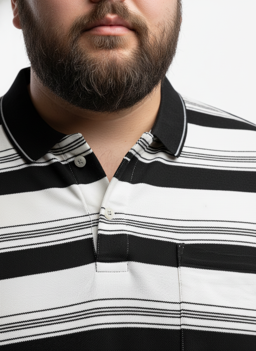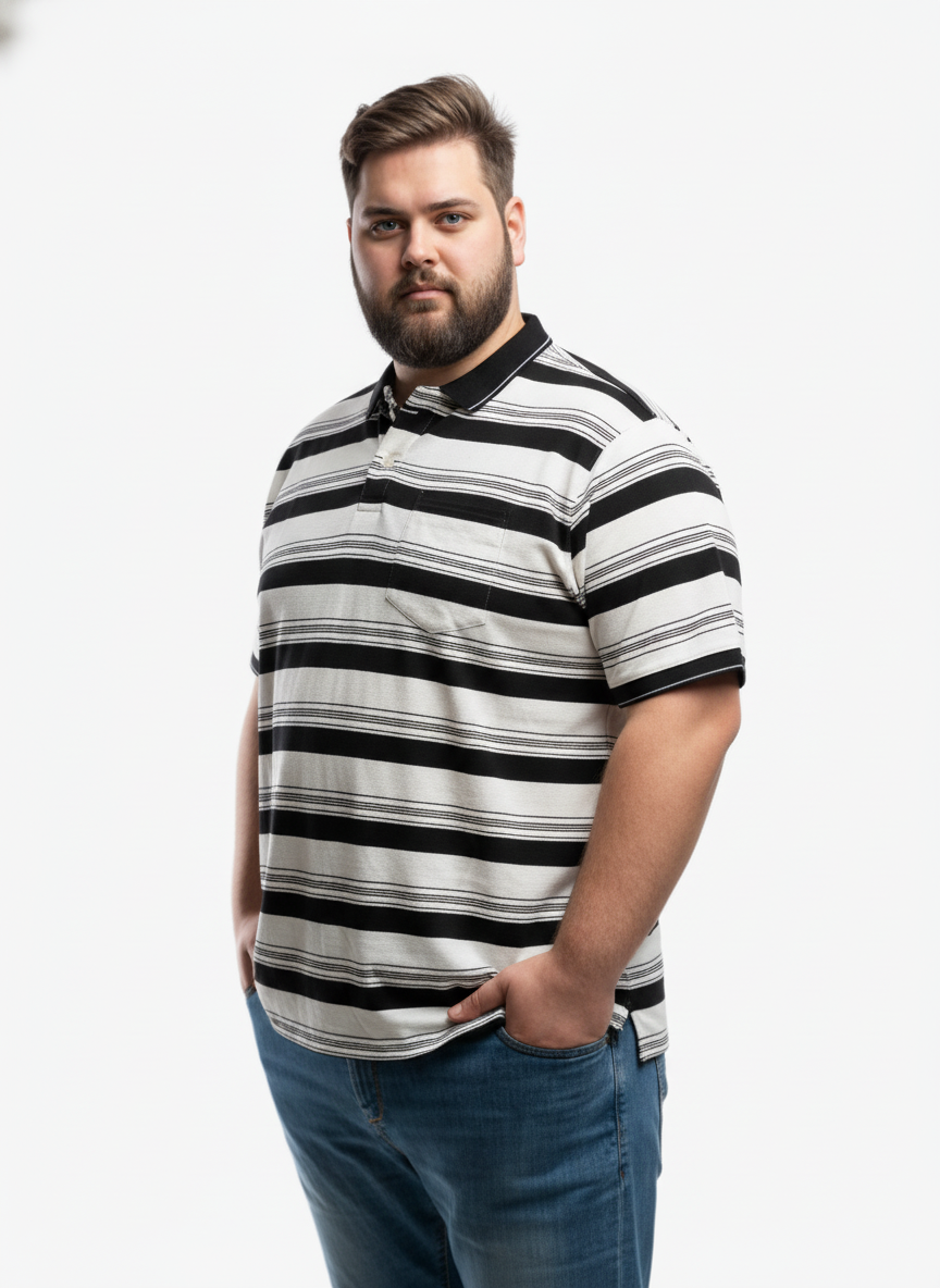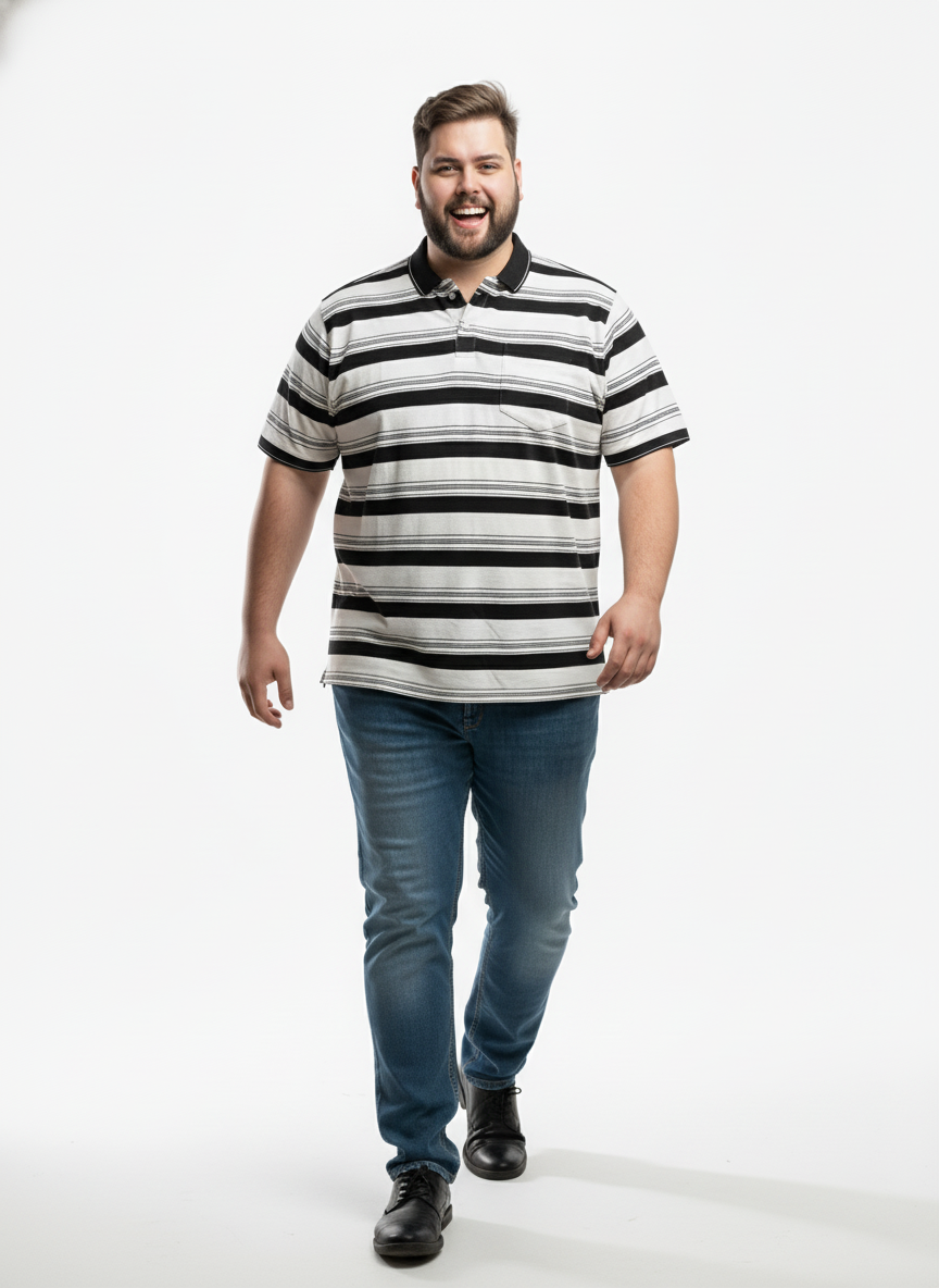 This men’s plus size striped polo t-shirt brings together timeless style and superior comfort for everyday wear. Designed with classic horizontal stripes and a smart collared neckline, it offers a refined casual look that’s easy to pair with jeans or chinos. The short sleeves and relaxed fit ensure unrestricted movement and a flattering silhouette, keeping you comfortable and confident all day long.Crafted from premium soft cotton fabric, this polo t-shirt feels gentle on the skin and allows excellent breathability, making it ideal for both indoor and outdoor wear. Whether you’re heading out for a casual outing, a laid-back office day, or a weekend get-together, this versatile piece effortlessly combines comfort and classic fashion for the modern plus-size man.