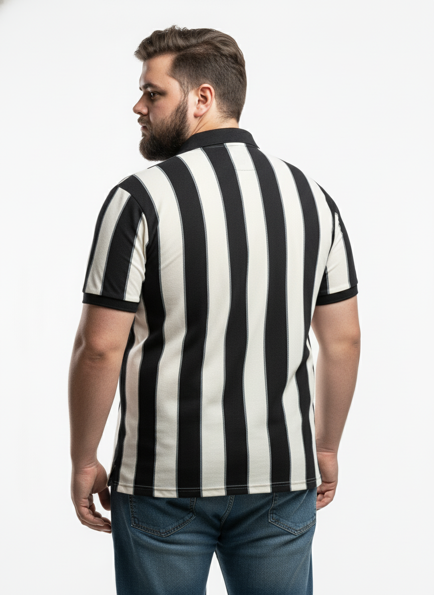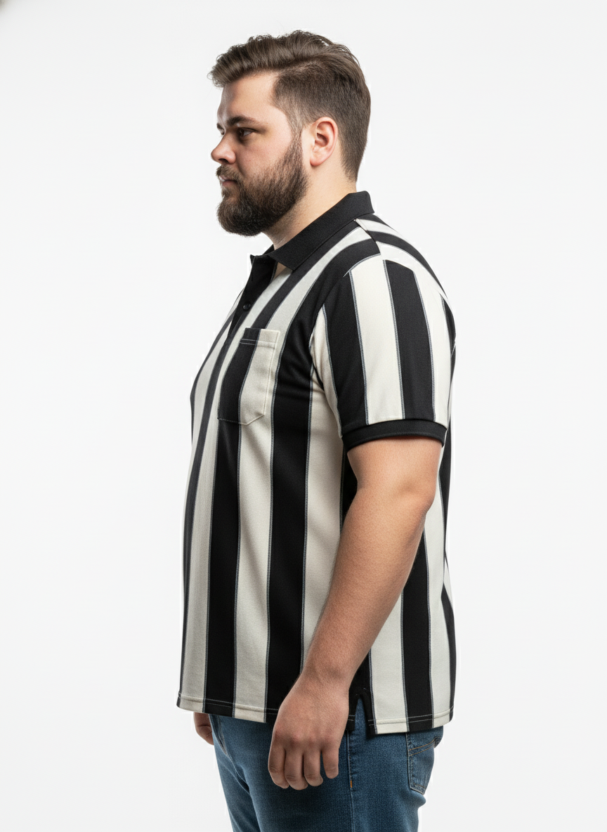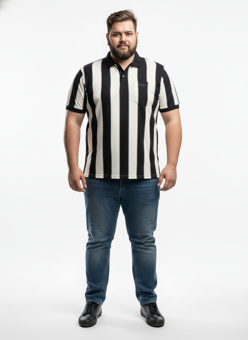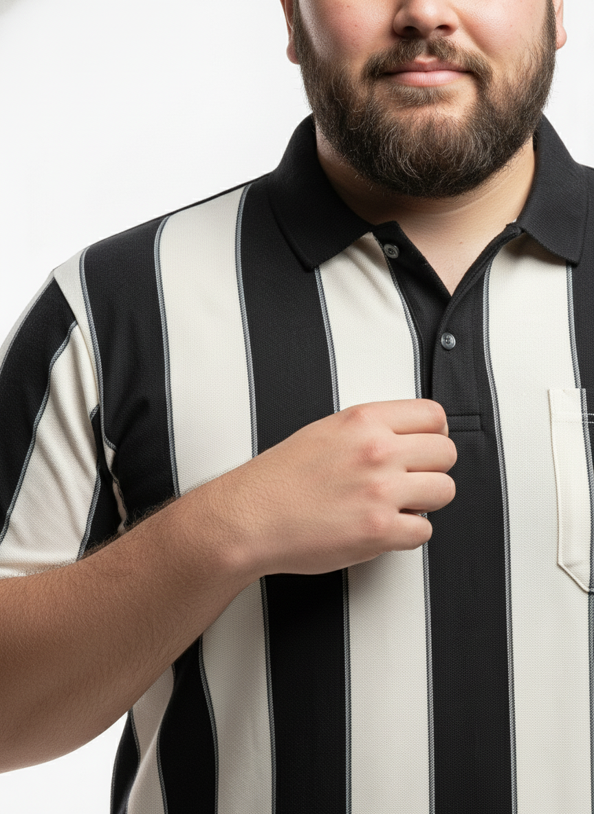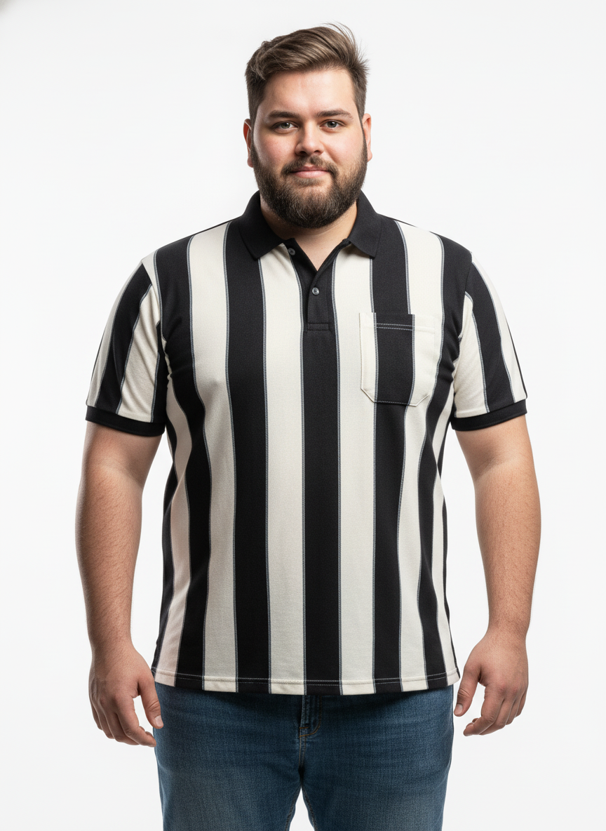 This men’s plus size polo t-shirt features bold vertical stripes that add a smart and elongated look, perfect for casual outings or semi-formal occasions. Designed with a comfortable classic fit, it offers extra room around the chest and waist, ensuring ease of movement and all-day comfort. The collared neckline with a button placket adds a refined touch, while the front pocket enhances both style and functionality. Crafted from a soft, breathable cotton blend fabric, this t-shirt keeps you cool and relaxed even during long wear. Its durable stitching and smooth texture make it an easy choice for everyday style, pairing effortlessly with jeans, chinos, or shorts for a confident, laid-back appearance.